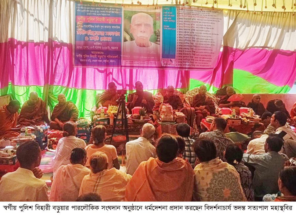 রাঙ্গুনীয়া উপজেলাধীন দক্ষিণ রাজানগর দেওয়ান বাজার গ্রাম (রাজভান্ডার বাড়ি)-এর স্বর্গীয় বেনী মাধব বড়ুয়া এবং স্বর্গীয়া কুমদীনি বালা বড়ুয়ার ২য় সন্তান রাজানগর রাজবিহার এবং দেওয়ান বাজার বেনুবন বিহারের ধার্মিক উপাসক স্বর্গীয় পুলিন বিহারী বড়ুয়ার ১ম মৃত্যুবার্ষিকী উপলক্ষে পরিবারের তিন পুত্র রুপায়ন বড়ুয়া, সুপায়ন বড়ুয়া, নিদায়ন বড়ুয়া এবং চার কন্যা শুক্লা বড়ুয়া, সুপ্তা বড়ুয়া, তানিয়া বড়ুয়া এবং সুইটি বড়ুয়ার উদ্যোগে গতকাল ৮ নভেম্বার শুক্রবার মহতী অষ্টপরিষ্কার, মহা সংঘদান এবং জ্ঞাতি ভোজন অনুষ্ঠিত হয়।
